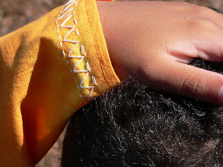 This contest is killing me. Yet again, I have to pull some idea out of space and then pull the embroidery pattern out of space and then create something. WHERE is the guidance? WHERE is the pattern to follow? Can you sense that I crave a bit more structure with my sewing (and my life)? Well, my son has desperately wanted to be the "subject" of one of my challenges so I thought this was a great opportunity to include him. He selected the soft, bright (brightest, I should say) orange batik fabric and approved of the tunic design that I modified from Sewing For Boys.
